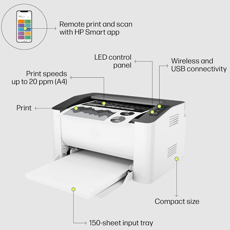 HP Laser 1008w Printer, Wireless, Single Function, Print, Hi-Speed USB 2.0, Up to 21 ppm, 150-sheet Input Tray, 100-sheet Output Tray, 10,000-page Duty Cycle, 1-Year Warranty, Black and White, 714Z9A