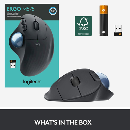 • Plastic parts in ERGO M575 include post consumer recycled plastic (Graphite/Black: 50%, Off-White: 21%). Uses FSC-certified paper for responsible packaging.;System Compatibility: Windows 10, 11 or later, Linux, macOS, iPadOS, Android
